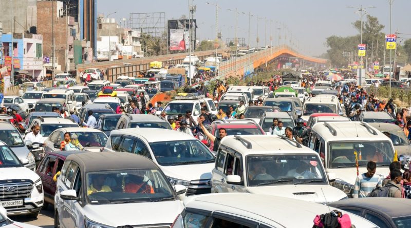 शहर की ओर से मेले में प्रवेश करने वाले प्रमुख मार्ग पुराने हर्षवर्धन चौराहे के पास अलोपीबाग चुंकी पुल के नीचे वाहनों की लंबी कतार लगी है।